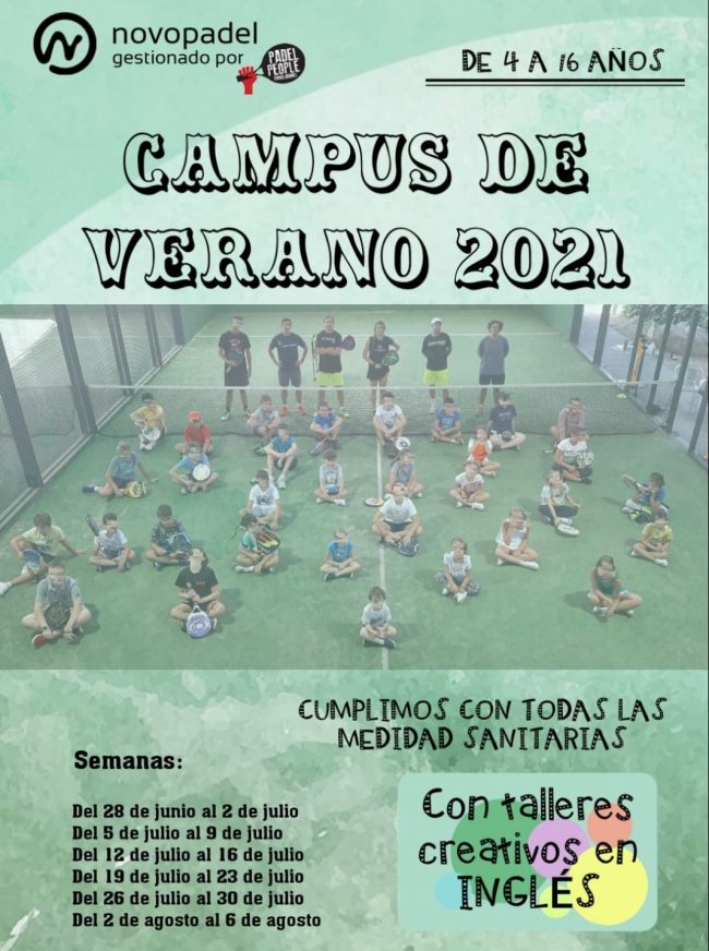 ¿DE QUÉ TRATA ESTE CAMPAMENTO? Es un campamento deportivo orientado al padel para niñ@s de edades comprendidas entre 4 y 16 años que se realiza en las instalaciones de Novopadel. En el campus se impartirán dos horas y media de padel, también realizarán actividades lúdico-deportivas y talleres creativos en INGLÉS ¿QUÉ HORARIOS TIENE EL…