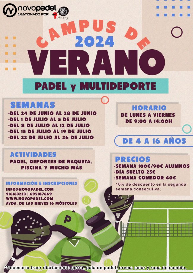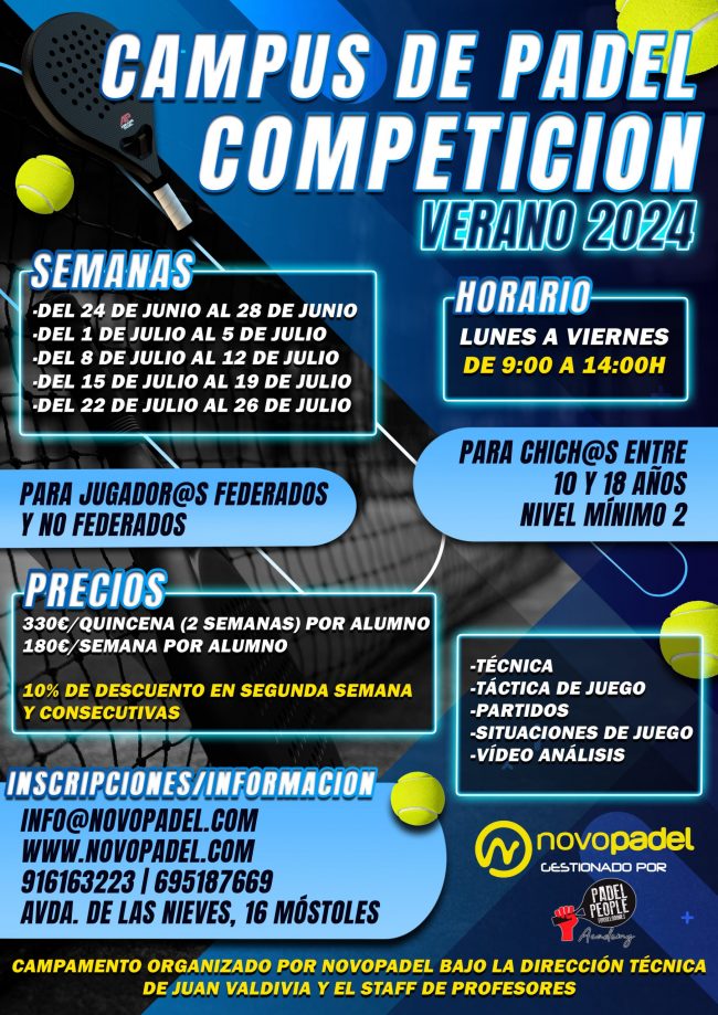 ¿DE QUÉ TRATA ESTE CAMPAMENTO? Es un campamento deportivo orientado al padel para chic@s de edades comprendidas entre 10 y 18 años tanto federados como no federados que se realiza en las instalaciones de Novopadel. ¿QUÉ HORARIOS TIENE EL CAMPAMENTO? De lunes a viernes de 9:00h a 14:00h ¿QUIÉN ORGANIZA EL CAMPAMENTO? Este…