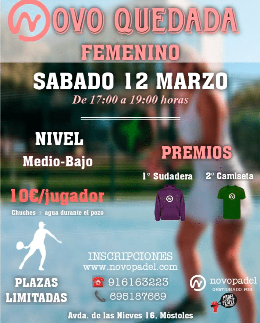 Avd. de las Nieves 16 · Móstoles 28935 · Madrid 916163223 - 695187669info@novopadel.comL-V 9:00h a 23:00h S y D 9:00h a 14:00h / 16:00h a 21:30h