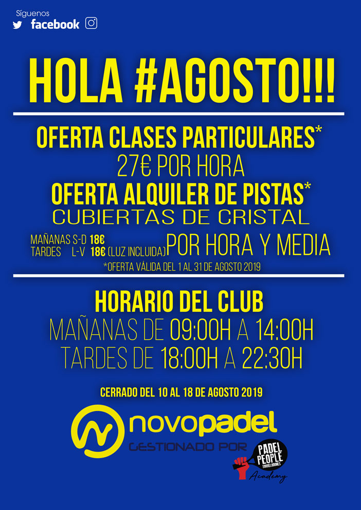 Avd. de las Nieves 16 · Móstoles 28935 · Madrid 916163223 - 695187669info@novopadel.comL-V 9:00h a 23:00h S y D 9:00h a 14:00h / 16:00h a 21:30h